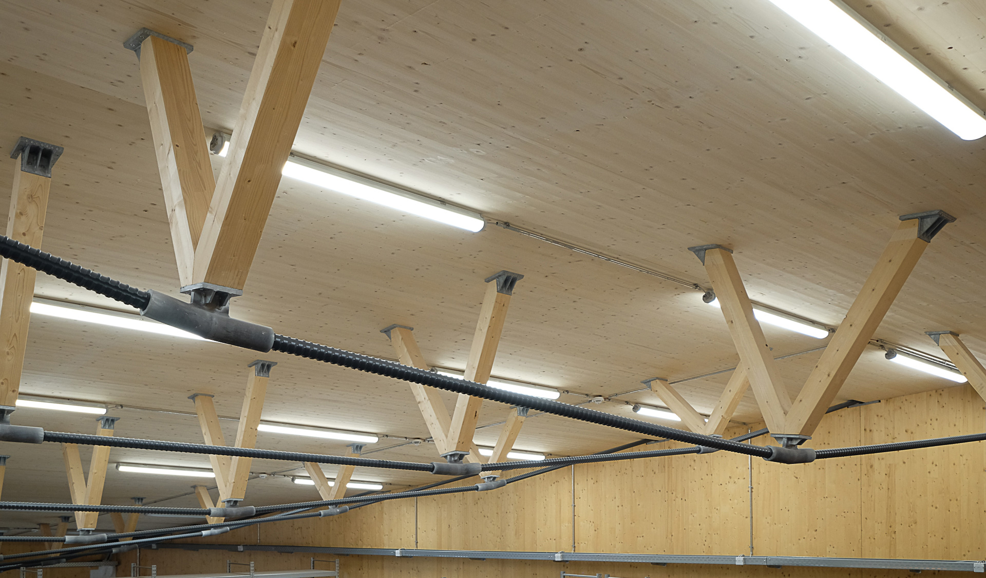 Die drei in Massivholzbauweise konstruierten Baukörper gruppieren sich dabei um einen in den Hang integrierten zentralen Betriebshof.
